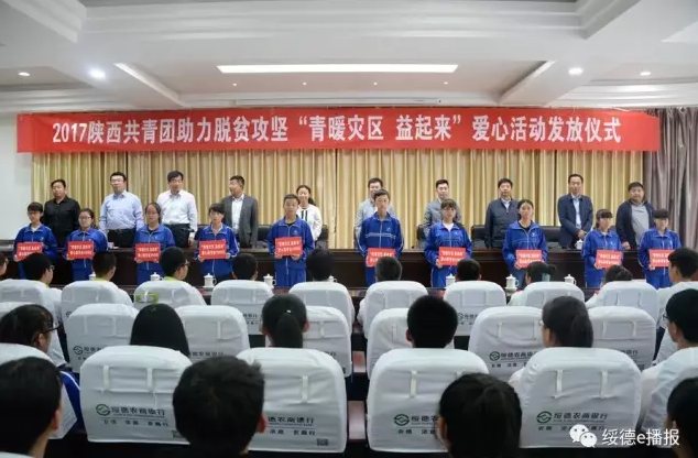为助力陕西各级共青团组织 “精准扶贫、精准脱贫”,团省委、省青企协、省青基会动员省市青企协会员筹资10万元,资助绥德县贫困受灾高中、中职学生共计100名,每人1000元。