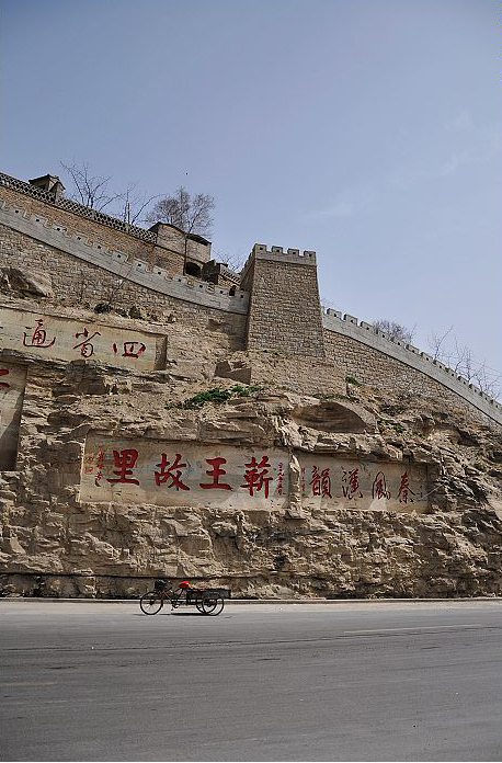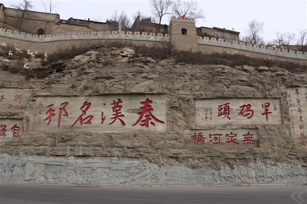 摩崖石刻景观称为“秦时明月汉时关”。早有“旱码头”之称的绥德,地理位置特殊,商贸业繁华,是历代兵家必争之地,也引得历代骚人墨客在此留下墨宝。而绥德的石雕艺术更是源远流长,代代相传。历经秦汉唐宋,于明清时期,绥德古城内遗留的人文景观、摩崖石刻以及民间广泛流传的石雕艺术品不胜枚举。诸如秦时扶苏监军驻绥时“太子府”遗址、“赏月台”遗址、呜咽泉景观和疏属山巅的扶苏墓、扶苏祠等景观;“晋溪洞”“龙洞清流”“天下名州”等摩崖石刻;以及民间老乡家保锁娃娃的炕头石狮狮,还有那些深埋墓葬而被挖掘出土的东汉画像石。很多著名的摩崖石刻在“文革”中被毁坏,为了恢复被损坏的历史遗迹,反映绥德源远流长的人文历史,去年3月,由绥德县籍影视界美术大师霍廷宵先生无偿设计,绥德县委、县政府投资200万元实施的这项工程,现在主体工程已全部完成。